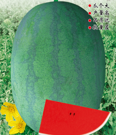 ■ 特征特性 :早中熟種,坐果至成熟28天左右,全生育期90天左右。植株長勢穩健,抗病抗逆性強,生態適應性廣,易坐果。果實橢圓形,果皮墨綠色底上覆暗條帶,果面光滑無棱帶蠟粉。瓤色深紅,瓤質酥脆,中心糖14%左右,口感好,風味佳。平均單果重8-10kg左右,大者20kg以上(特殊栽培),一般畝產6000公斤以上。皮厚1.0cm左右,果皮硬度強,耐儲運。高抗枯萎病抗重茬,兼抗炭疽病和病毒病,在2年重茬地種植,其產量品質無明顯差異。綜合性狀優于目前抗病品種。