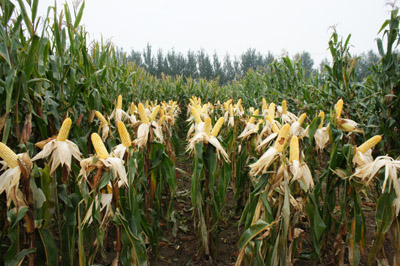 田間表現(xiàn):株型緊湊,葉片上沖,株高265-280厘米,穗位100厘米,穗長(zhǎng)21-25厘 米,穗粗6厘米,紅軸,籽粒黃色,馬齒型,出籽率90%,百粒重43.2克。莖稈堅(jiān)韌,根系發(fā)達(dá),高抗倒伏。無禿尖,抗旱,耐澇,特抗病。