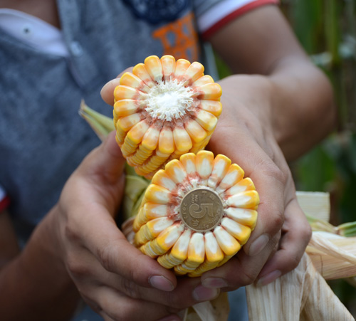 特征特性:該品種株型緊湊,幼苗葉鞘紫色,株高265-298厘米,穗位95-116厘米。平均生育期99-108天。果穗筒型,穗軸紅色,穗長18.5厘米,穗行數16-18行。籽粒黃色,馬齒型,千粒重354.0克,出籽率86.4%-90%
