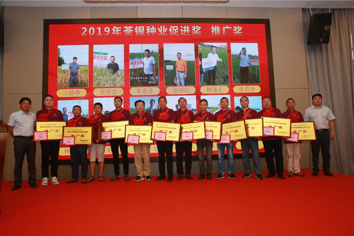 ??? 2019年9月1日,安徽張海銀種業基金會“荃銀種業促進獎”頒獎大會暨荃銀高科水稻品種展示會在合肥召開。中國種業十大功勛人物、荃銀高科創始人、安徽張海銀種業基金會理事長張海銀,安徽省種子管理總站原站長、基金會專家組顧問成員、“荃銀種業促進獎”評審委員會主任孔令傳,荃銀高科副董事長、總經理、基金會副理事長張琴,荃銀高科董事、常務副總經理、基金會副理事長王玉林,荃銀高科副總經理、荃銀農科院院長、首席技術官張從合,基金會秘書長張彤,荃銀高科總經理助理劉義銳、監事會主席謝慶軍,荃銀高科工會主席、基金會監事鄭滿生,中化現代農業、中化化肥等單位領導嘉賓,以及來自湖北省16個縣區180多位三農一線種業工作者參加了會議。